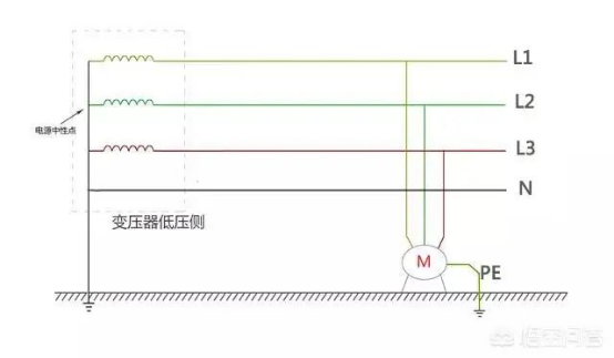 从上图可以看出:在TT供电系统中,变压器分别引出L1、L2、L3、N四条线,但是并没有引出地线。